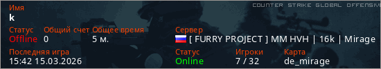 Играет на Counter Strike Global Offensive сервере. Страна: РоссияПервый раз замечен 15:11 15.03.2026