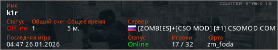Играет на Counter Strike 1.6 сервере. Страна: РоссияПервый раз замечен 04:45 26.01.2026