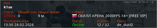 Играет на Counter Strike 1.6 сервере. Страна: РоссияПервый раз замечен 11:01 28.02.2026