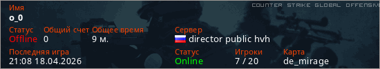 Играет на Counter Strike Global Offensive сервере. Страна: РоссияПервый раз замечен 20:29 18.04.2026