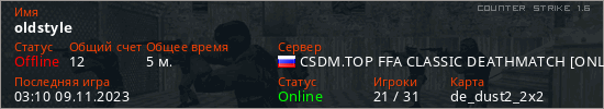 Играет на Counter Strike 1.6 сервере. Страна: РоссияПервый раз замечен 02:39 09.11.2023