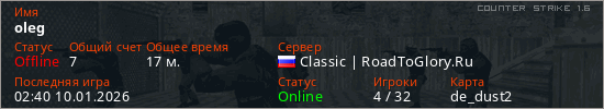 Играет на Counter Strike 1.6 сервере. Страна: РоссияПервый раз замечен 03:20 07.01.2026