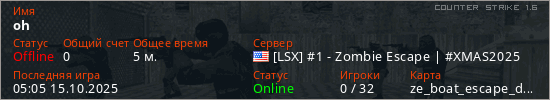 Играет на Counter Strike 1.6 сервере. Страна: СШАПервый раз замечен 04:57 15.10.2025
