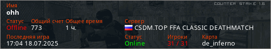 Играет на Counter Strike 1.6 сервере. Страна: РоссияПервый раз замечен 10:00 07.02.2022