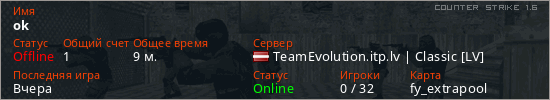 Играет на Counter Strike 1.6 сервере. Страна: ЛатвияПервый раз замечен 00:11 17.01.2026