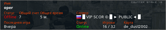 Играет на Counter Strike 1.6 сервере. Страна: РоссияПервый раз замечен 16:47 18.12.2025