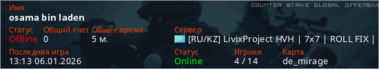 Играет на Counter Strike Global Offensive сервере. Страна: КазахстанПервый раз замечен 13:07 06.01.2026