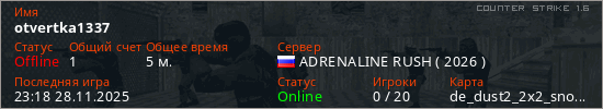 Играет на Counter Strike 1.6 сервере. Страна: РоссияПервый раз замечен 23:05 28.11.2025