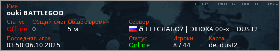 Играет на Counter Strike Global Offensive сервере. Страна: РоссияПервый раз замечен 03:14 06.10.2025