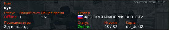 Играет на Counter Strike 1.6 сервере. Страна: РоссияПервый раз замечен 20:56 24.07.2025
