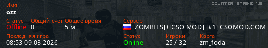 Играет на Counter Strike 1.6 сервере. Страна: РоссияПервый раз замечен 08:50 09.03.2026