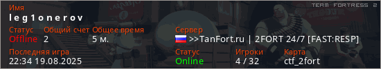 Играет на Team Fortress 2 сервере. Страна: РоссияПервый раз замечен 21:34 19.08.2025