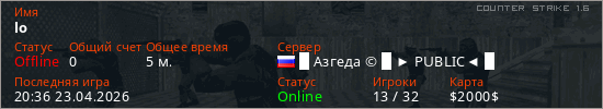 Играет на Counter Strike 1.6 сервере. Страна: РоссияПервый раз замечен 20:34 23.04.2026