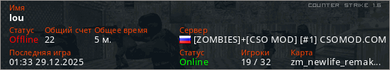 Играет на Counter Strike 1.6 сервере. Страна: РоссияПервый раз замечен 01:31 29.12.2025