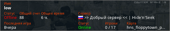 Играет на Counter Strike 1.6 сервере. Страна: РоссияПервый раз замечен 15:32 23.10.2025