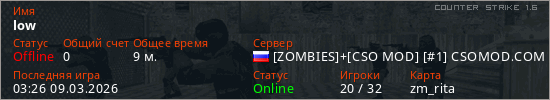 Играет на Counter Strike 1.6 сервере. Страна: РоссияПервый раз замечен 23:33 02.03.2026