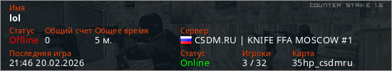 Играет на Counter Strike 1.6 сервере. Страна: РоссияПервый раз замечен 21:42 20.02.2026