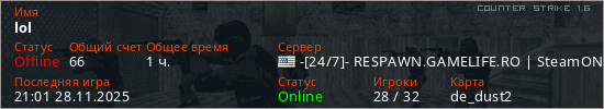 Последний раз был в сети 21:01 28.11.2025 Игрок с таким ником замечен на 66 серверах