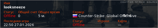 Играет на Counter Strike Source сервере. Страна: РоссияПервый раз замечен 22:31 27.01.2026