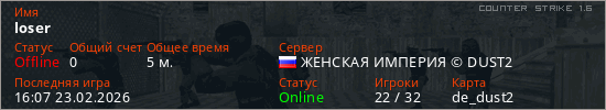 Играет на Counter Strike 1.6 сервере. Страна: РоссияПервый раз замечен 15:56 23.02.2026