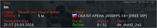 Играет на Counter Strike 1.6 сервере. Страна: РоссияПервый раз замечен 21:13 25.03.2026