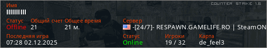 Играет на Counter Strike 1.6 сервере. Страна: СШАПервый раз замечен 16:17 17.07.2025