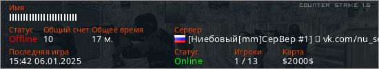 Играет на Counter Strike 1.6 сервере. Страна: РоссияПервый раз замечен 13:00 03.01.2025