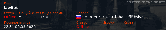 Играет на Counter Strike Source сервере. Страна: РоссияПервый раз замечен 17:57 23.02.2026