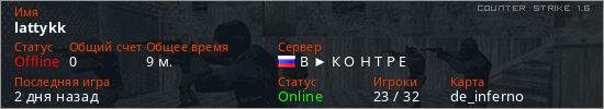 Играет на Counter Strike 1.6 сервере. Страна: РоссияПервый раз замечен 19:05 17.03.2026