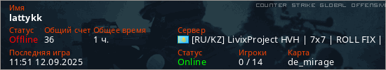 Играет на Counter Strike Global Offensive сервере. Страна: КазахстанПервый раз замечен 13:34 30.08.2025