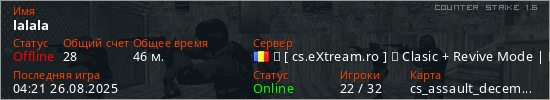 Играет на Counter Strike 1.6 сервере. Страна: РумынияПервый раз замечен 15:35 21.12.2024