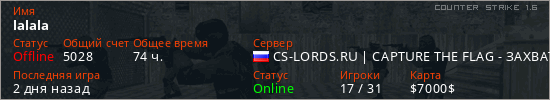 Играет на Counter Strike 1.6 сервере. Страна: РоссияПервый раз замечен 02:24 12.04.2022