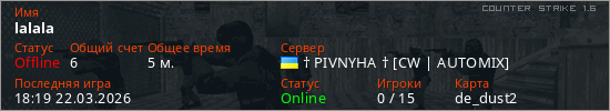 Играет на Counter Strike 1.6 сервере. Страна: УкраинаПервый раз замечен 18:17 22.03.2026
