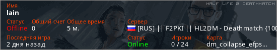 Играет на Half Life 2 DeathMatch сервере. Страна: РоссияПервый раз замечен 13:27 09.03.2026