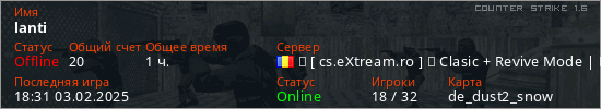 Играет на Counter Strike 1.6 сервере. Страна: РумынияПервый раз замечен 20:18 03.12.2024