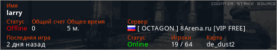 Играет на Counter Strike Source сервере. Страна: РоссияПервый раз замечен 19:55 25.04.2026