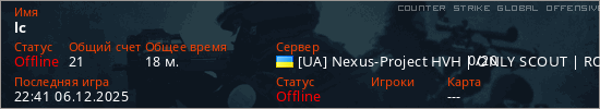 Играет на Counter Strike Global Offensive сервере. Страна: УкраинаПервый раз замечен 19:13 06.12.2025