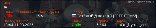 Играет на Team Fortress 2 сервере. Страна: РоссияПервый раз замечен 13:38 11.03.2026