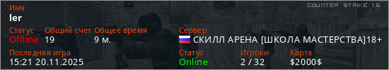 Играет на Counter Strike 1.6 сервере. Страна: РоссияПервый раз замечен 20:45 18.11.2025