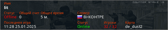 Играет на Counter Strike 1.6 сервере. Страна: РоссияПервый раз замечен 10:59 25.01.2025