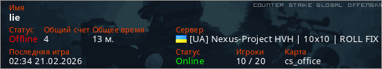 Играет на Counter Strike Global Offensive сервере. Страна: УкраинаПервый раз замечен 16:26 20.02.2026