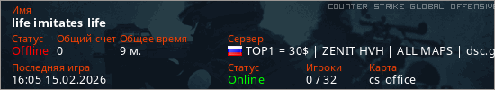 Играет на Counter Strike Global Offensive сервере. Страна: РоссияПервый раз замечен 23:34 09.02.2026
