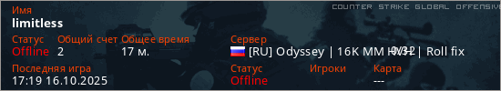 Играет на Counter Strike Global Offensive сервере. Страна: РоссияПервый раз замечен 21:31 06.07.2025