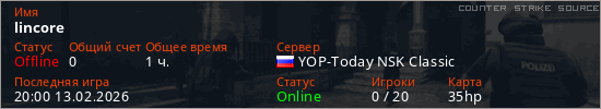 Играет на Counter Strike Source сервере. Страна: РоссияПервый раз замечен 22:50 05.02.2026