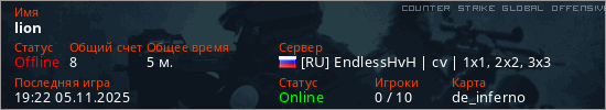 Играет на Counter Strike Global Offensive сервере. Страна: РоссияПервый раз замечен 19:20 05.11.2025
