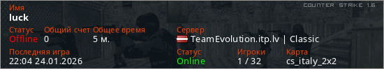Играет на Counter Strike 1.6 сервере. Страна: ЛатвияПервый раз замечен 21:59 24.01.2026