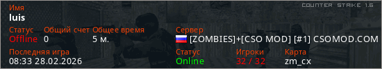 Играет на Counter Strike 1.6 сервере. Страна: РоссияПервый раз замечен 08:26 28.02.2026