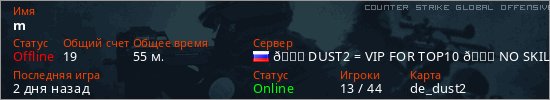 Играет на Counter Strike Global Offensive сервере. Страна: РоссияПервый раз замечен 13:59 16.01.2025