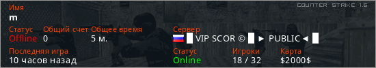 Играет на Counter Strike 1.6 сервере. Страна: РоссияПервый раз замечен 13:30 05.12.2025