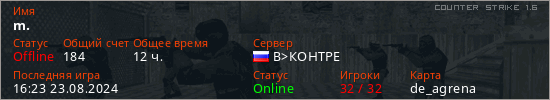 Играет на Counter Strike 1.6 сервере. Страна: РоссияПервый раз замечен 07:21 02.02.2021